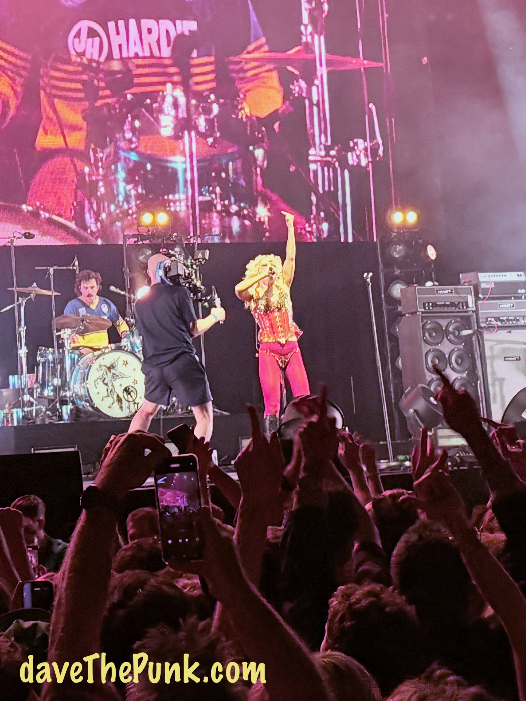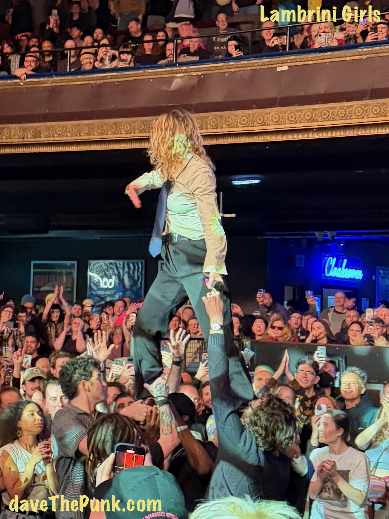 Phoebe took immediate command, hurling herself straight into a mosh pit that behaved like it had a personal vendetta against gravity. One minute she was in the crowd, the next she was being carried overhead in a tangle of limbs and grins. Later she was back onstage, only to reappear singing from the balcony like some punk-rock poltergeist who’d broken free of the venue’s health-and-safety handbook.