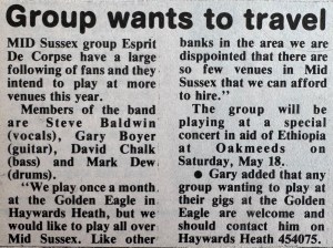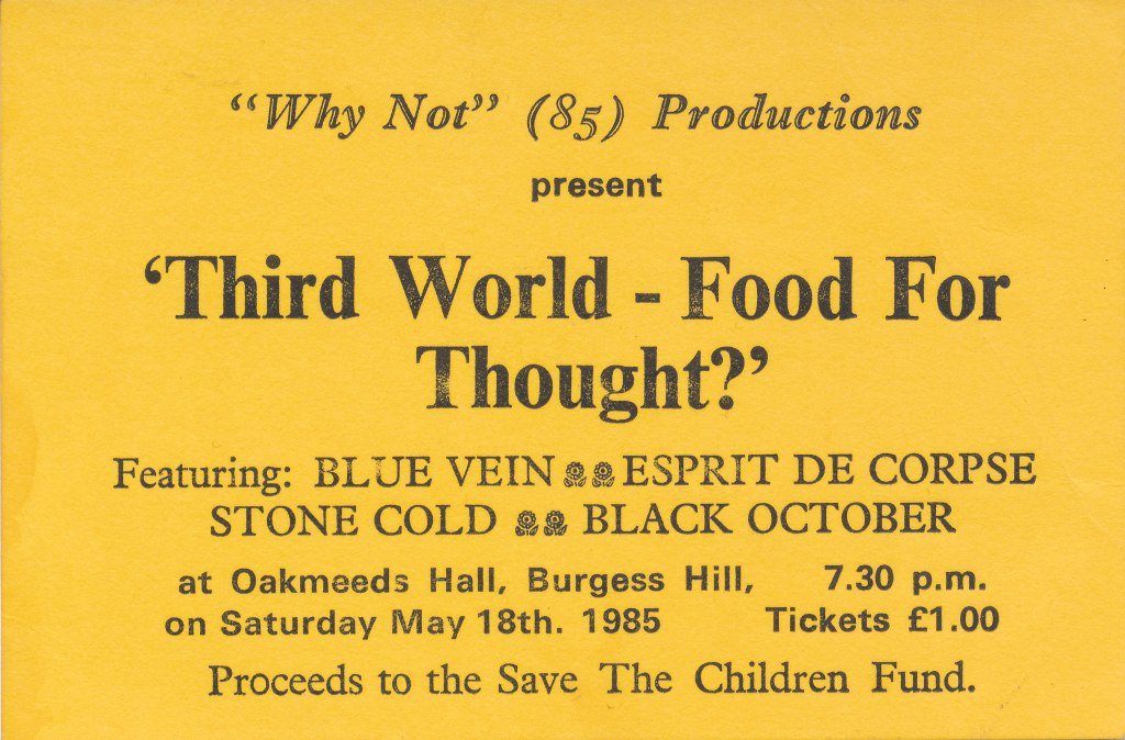 Their next gig? A blowout charity concert at Oakmeeds School on May 18th, raising funds for famine relief in Ethiopia. It’s called Third World – Food for Thought, and features Blue Vein, Stone Cold, and Black October in what might just be the punkiest PTA meeting ever held.