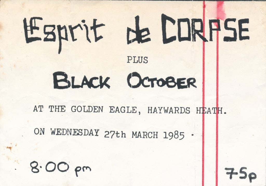 May 1985. Oakmeeds School, Burgess Hill. A charity gig dressed up as a college fundraiser but, in truth, a last stand for Esprit de Corpse. The bill read like a roll call of Sussex mischief… Stone Cold, Blue Vein, Black October, and us. Four bands, one stage, a few hundred kids, and a whole lot of racket.