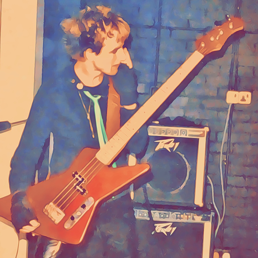 A cartoon-style image of Dave the Punk performing live on bass guitar with his teenage post-punk band Esprit de Corpse. Capturing the energy, attitude, and DIY spirit of the early 1980s underground scene.